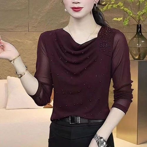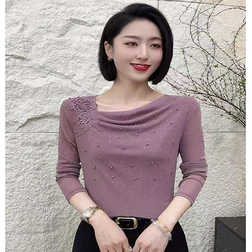 [1] 新款時尚 堆堆領純色燙鑽 減齡氣質小衫 網紗長袖款上衣,1入組 NT$1098